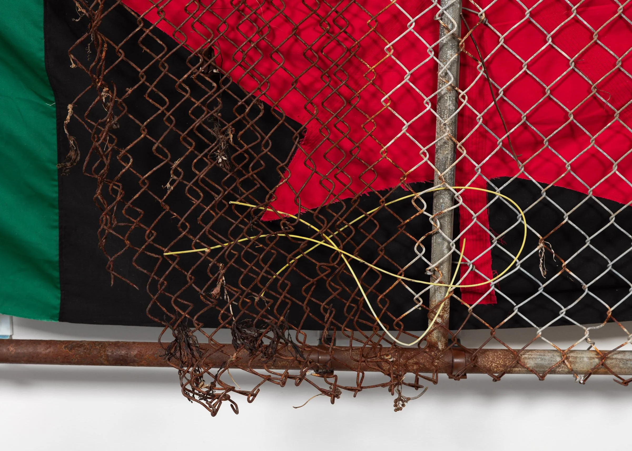 The flag is integrated with a fence salvaged from the shores of the Bedford Basin in Africville, Nova Scotia, becoming a powerful symbol of cultural reclamation, unity, and the resilience of Africville—a Black community forcibly displaced in the 1960s that remains a poignant marker of systemic erasure in Canada.